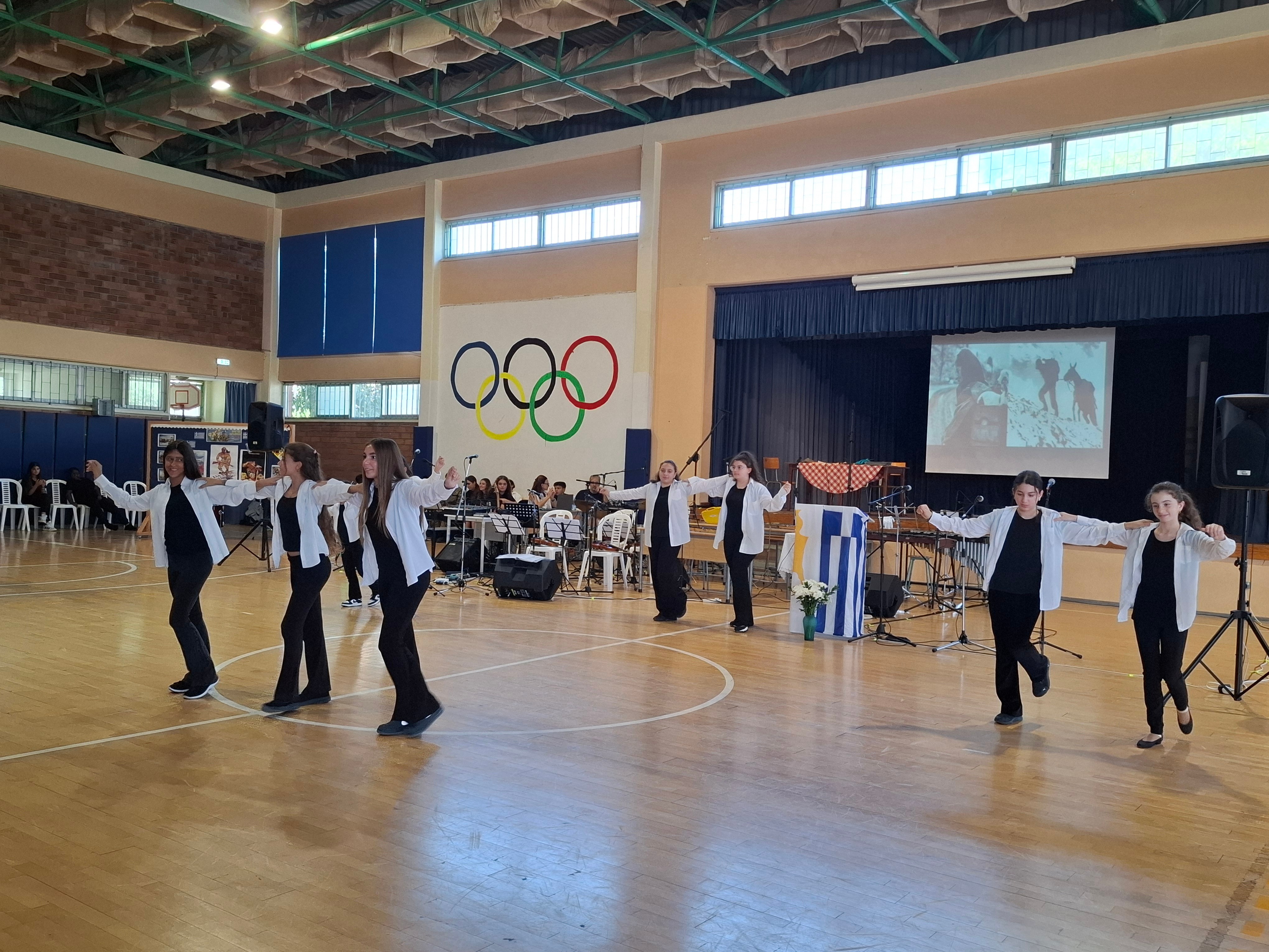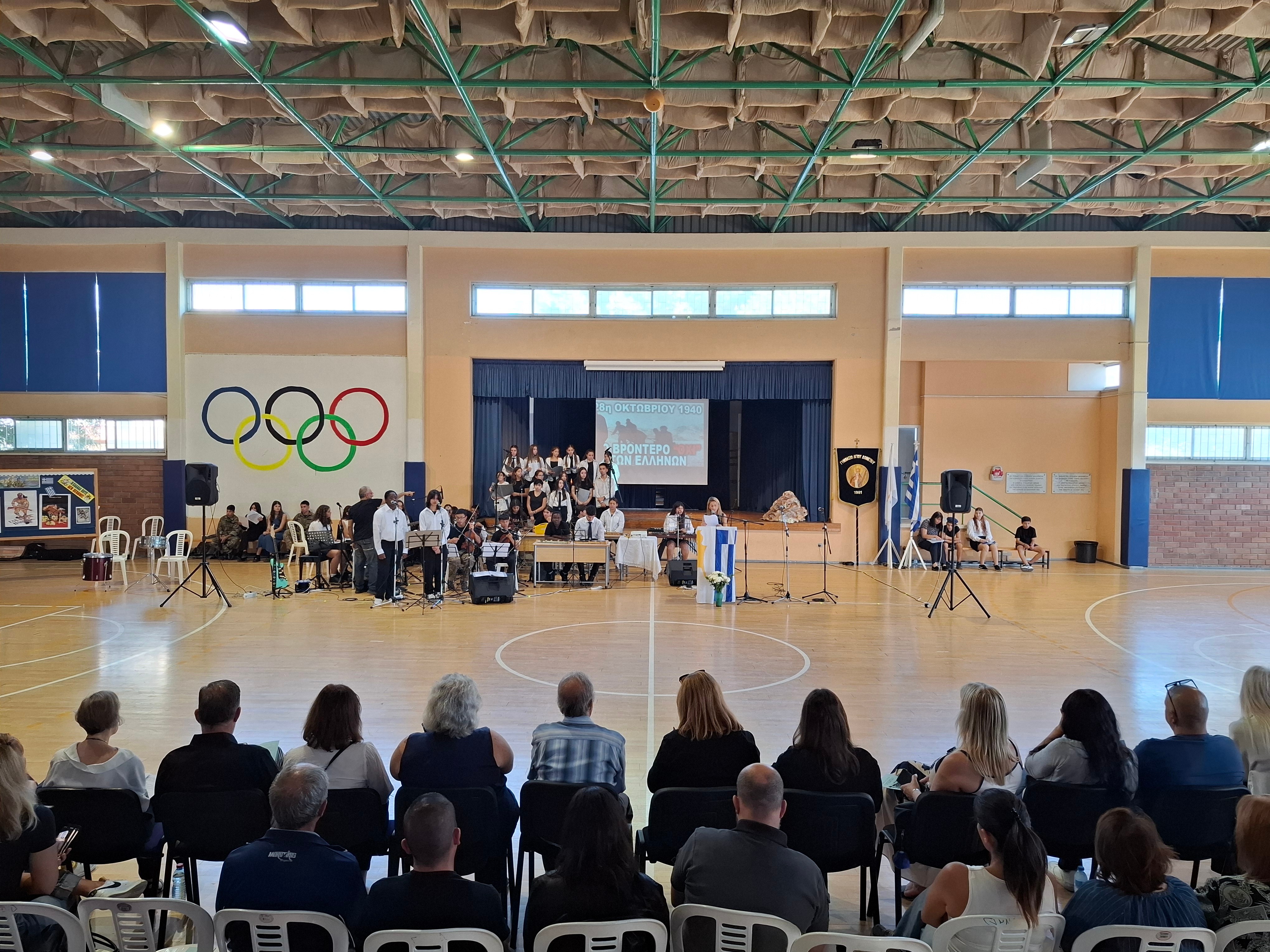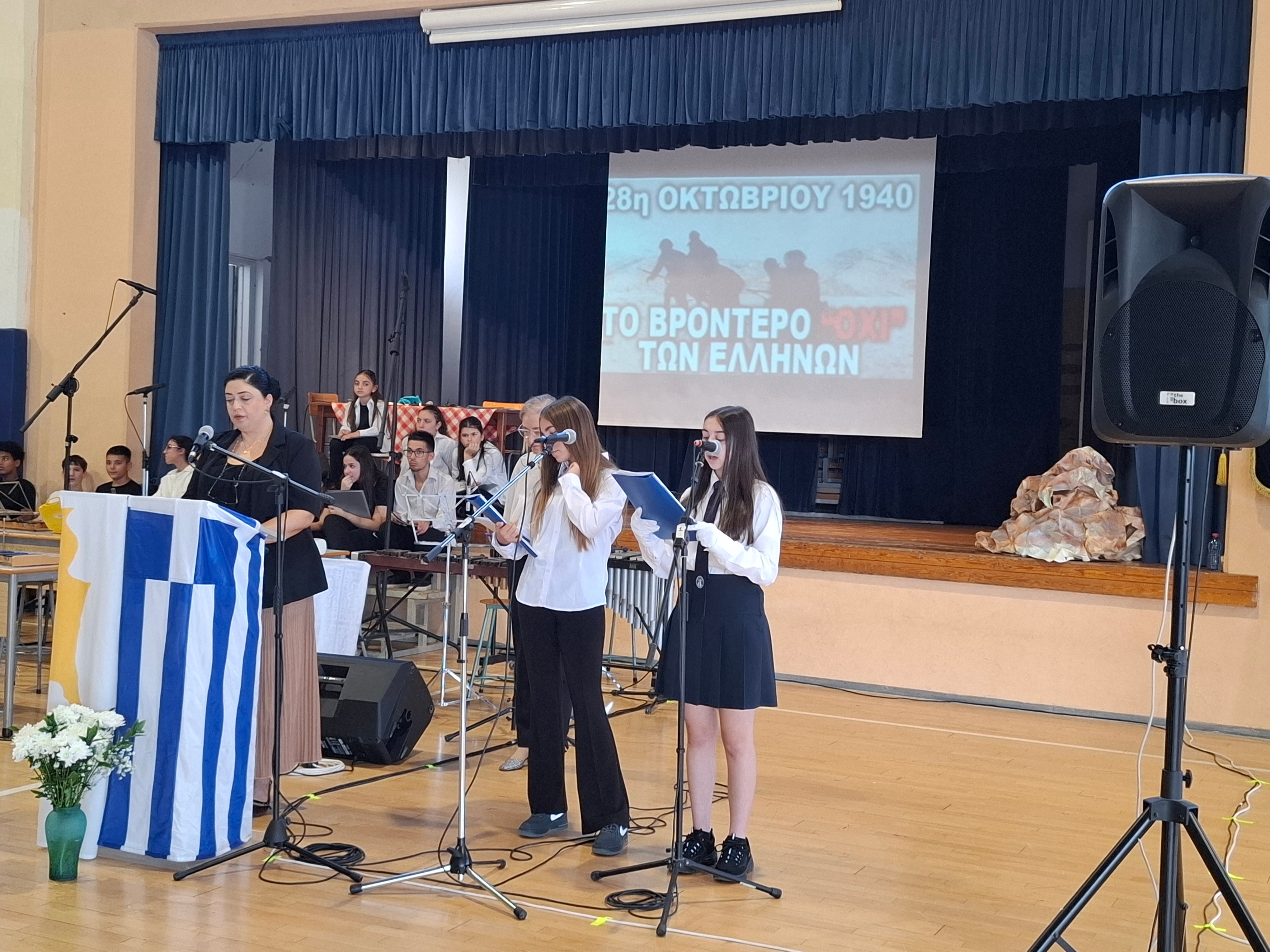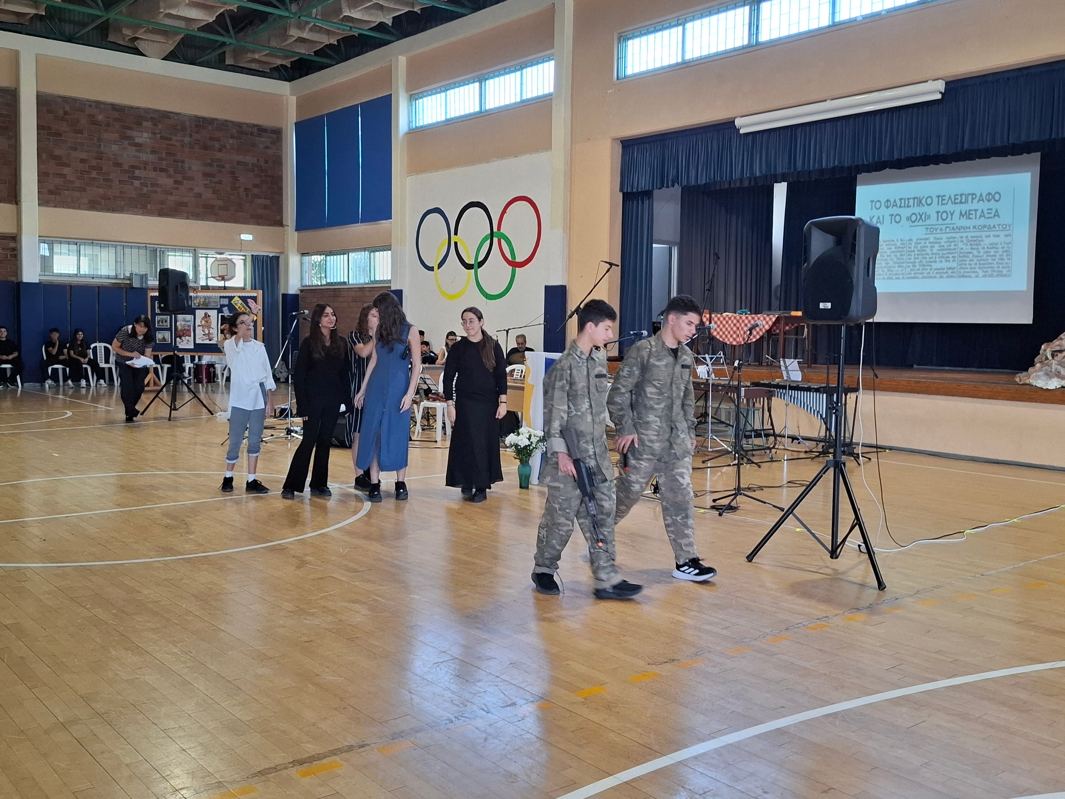 Ο ελληνικός λαός αγωνίστηκε γενναία για την ειρήνη, τη δημοκρατία και την ανεξαρτησία των λαών. Ας μας οδηγήσει το παράδειγμα αυτό ως μια φωτεινή ηλιαχτίδα στο σκοτάδι, στον αγώνα κατά της βίας του πολέμου και της προσβολής της ανθρώπινης αξιοπρέπειας. Για να περάσει το μήνυμα αυτό συνεργάστηκαν με ενθουσιασμό μαθητές και μαθήτριες, παρουσιάζοντας ελληνικούς χορούς, τραγούδια, ποιήματα και σκηνές από τον πόλεμο και τον αγώνα των Ελλήνων.