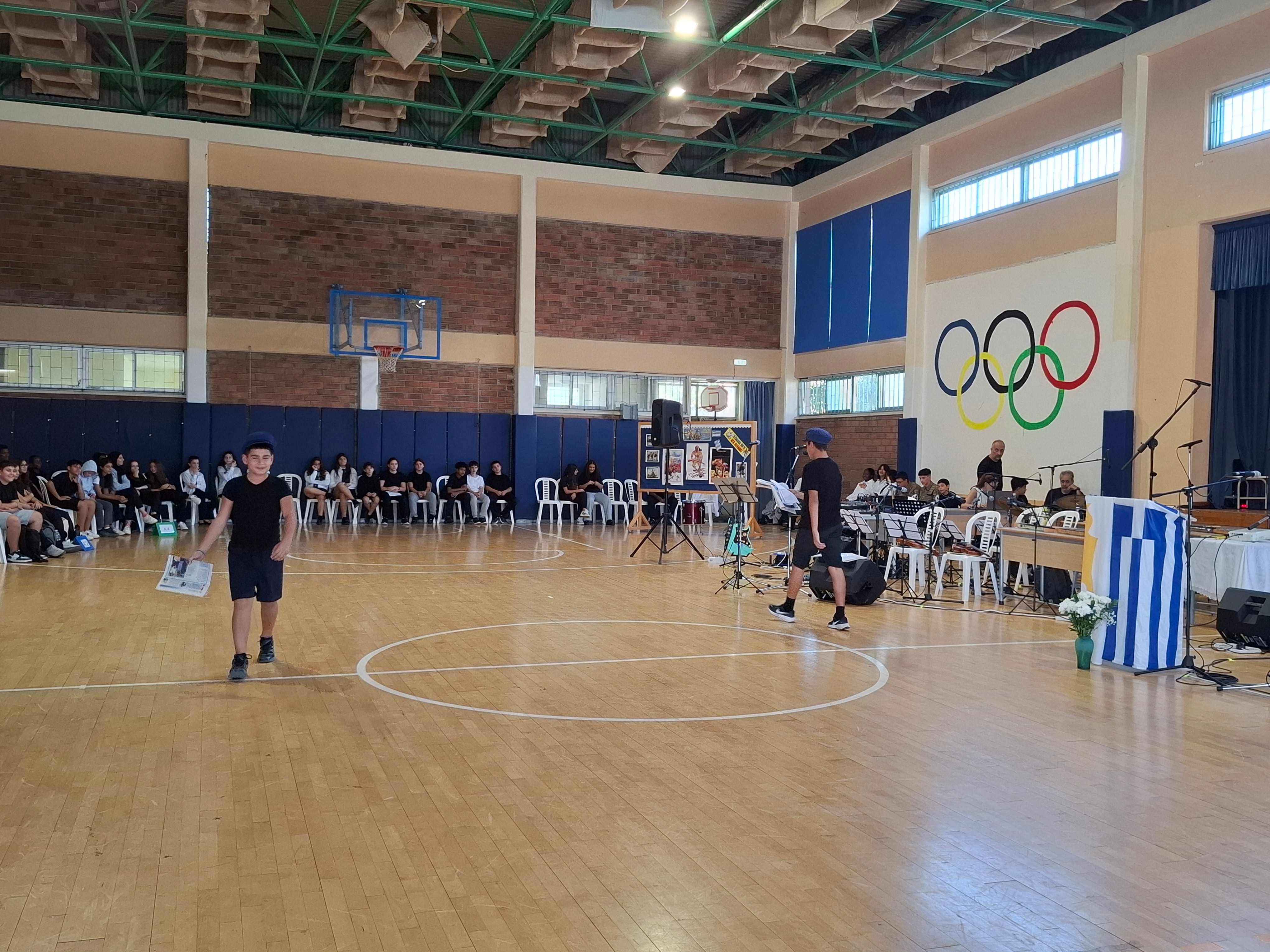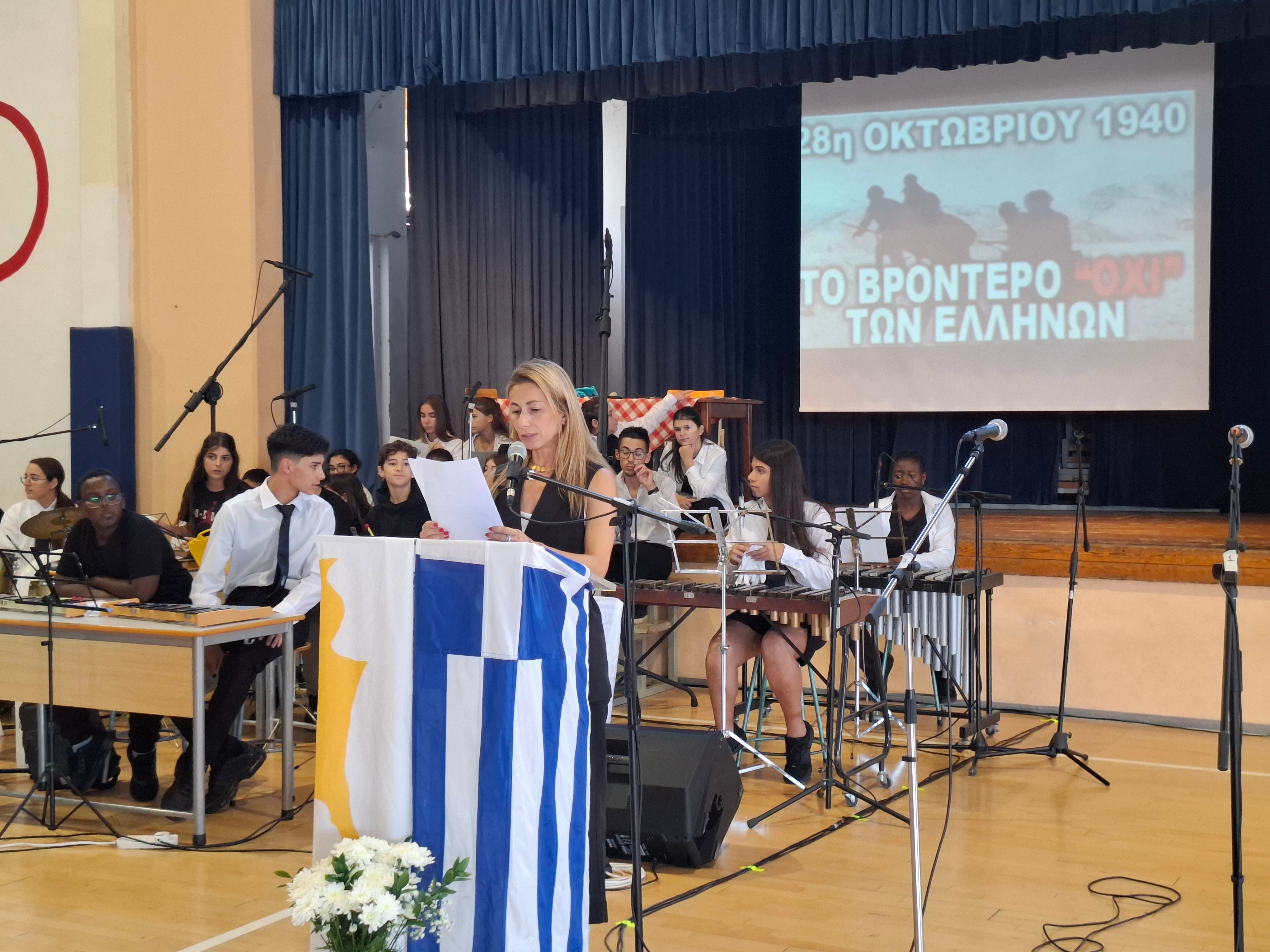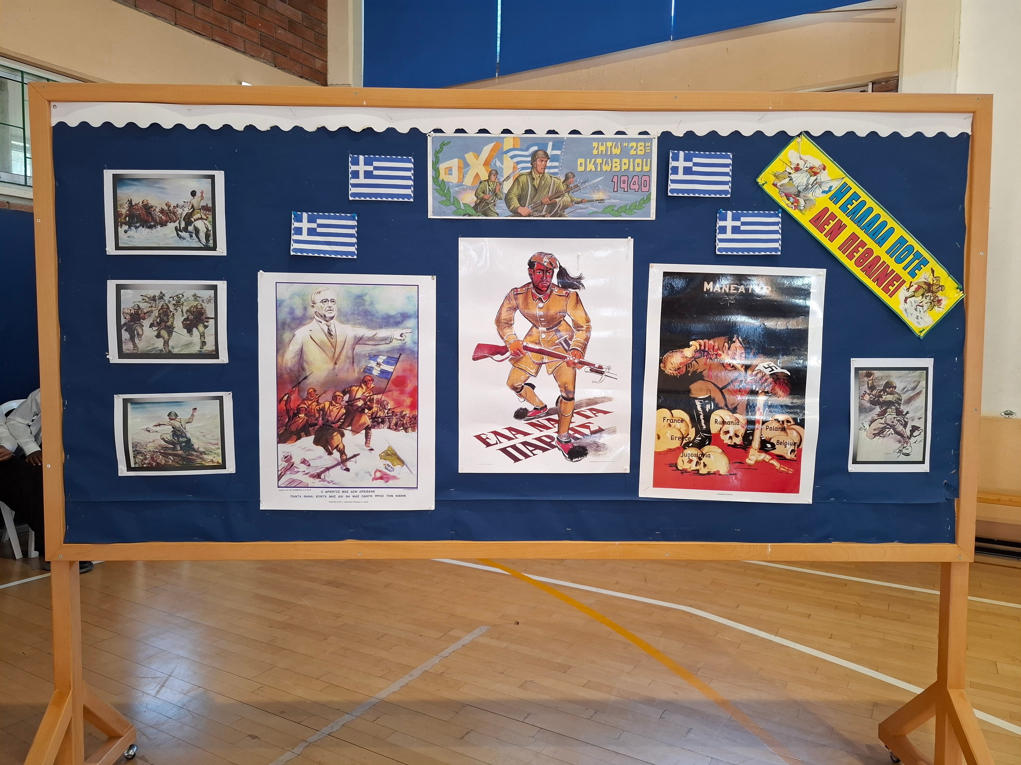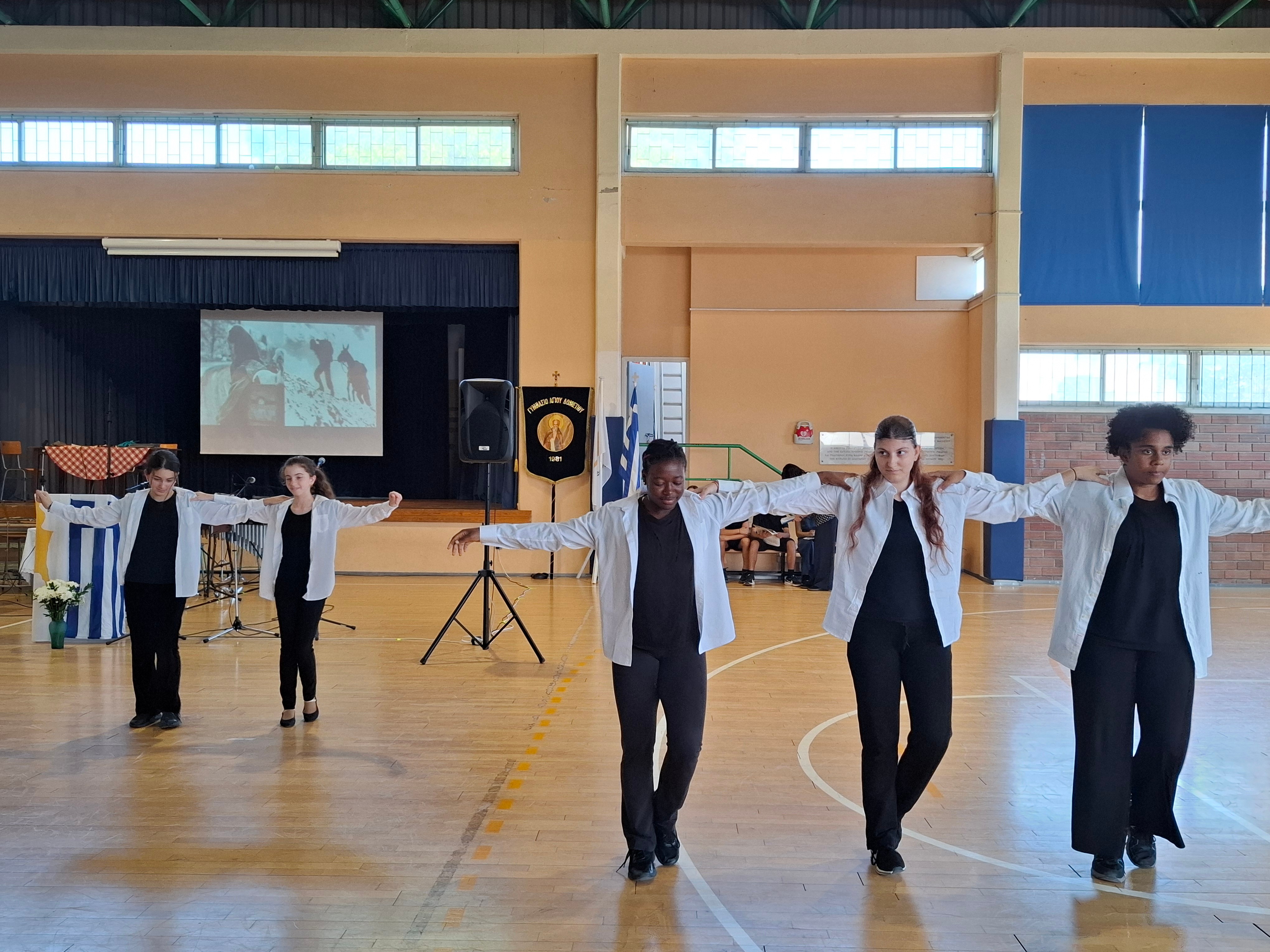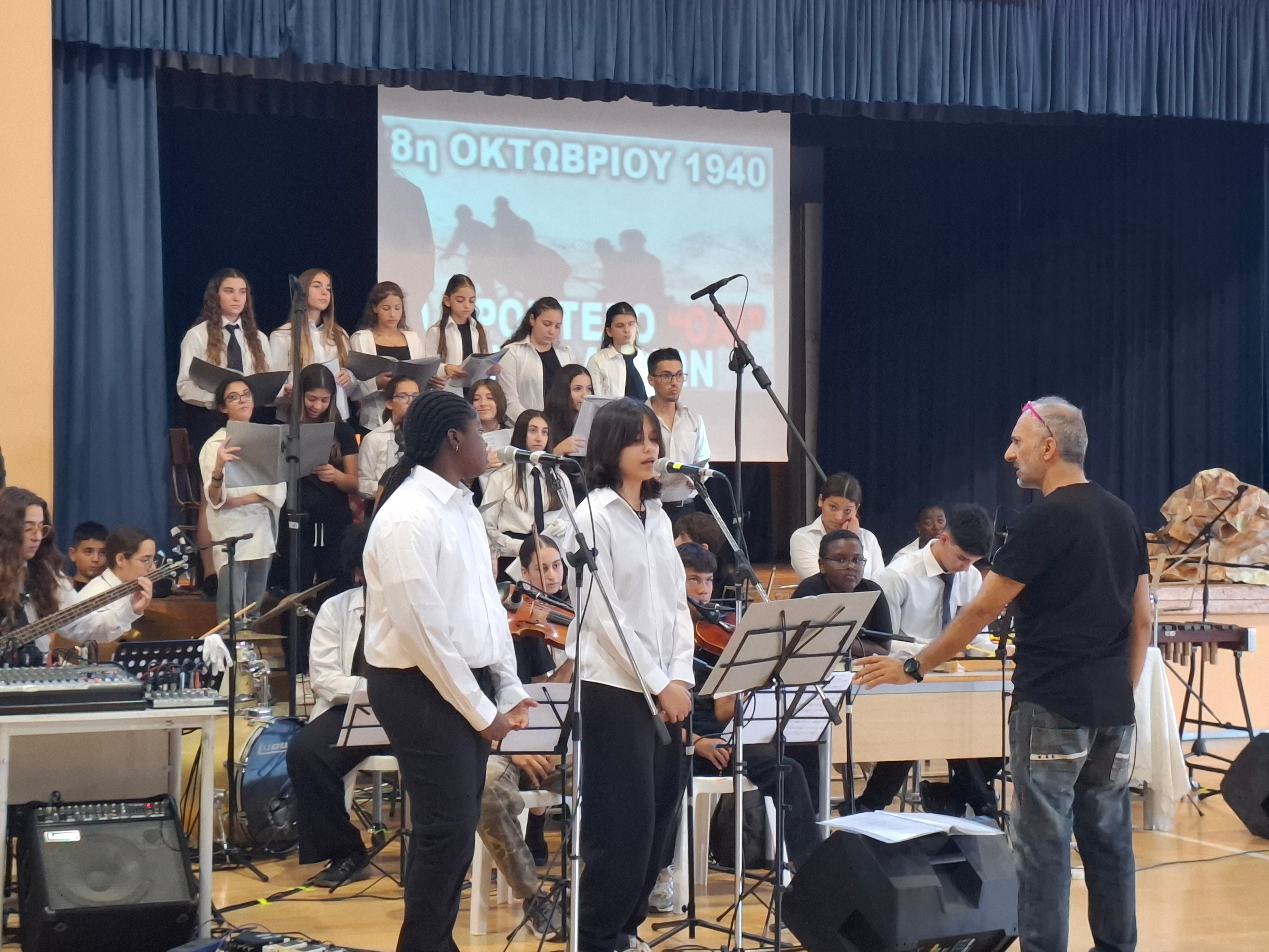 Ο ελληνικός λαός αγωνίστηκε γενναία για την ειρήνη, τη δημοκρατία και την ανεξαρτησία των λαών. Ας μας οδηγήσει το παράδειγμα αυτό ως μια φωτεινή ηλιαχτίδα στο σκοτάδι, στον αγώνα κατά της βίας του πολέμου και της προσβολής της ανθρώπινης αξιοπρέπειας. Για να περάσει το μήνυμα αυτό συνεργάστηκαν με ενθουσιασμό μαθητές και μαθήτριες, παρουσιάζοντας ελληνικούς χορούς, τραγούδια, ποιήματα και σκηνές από τον πόλεμο και τον αγώνα των Ελλήνων.