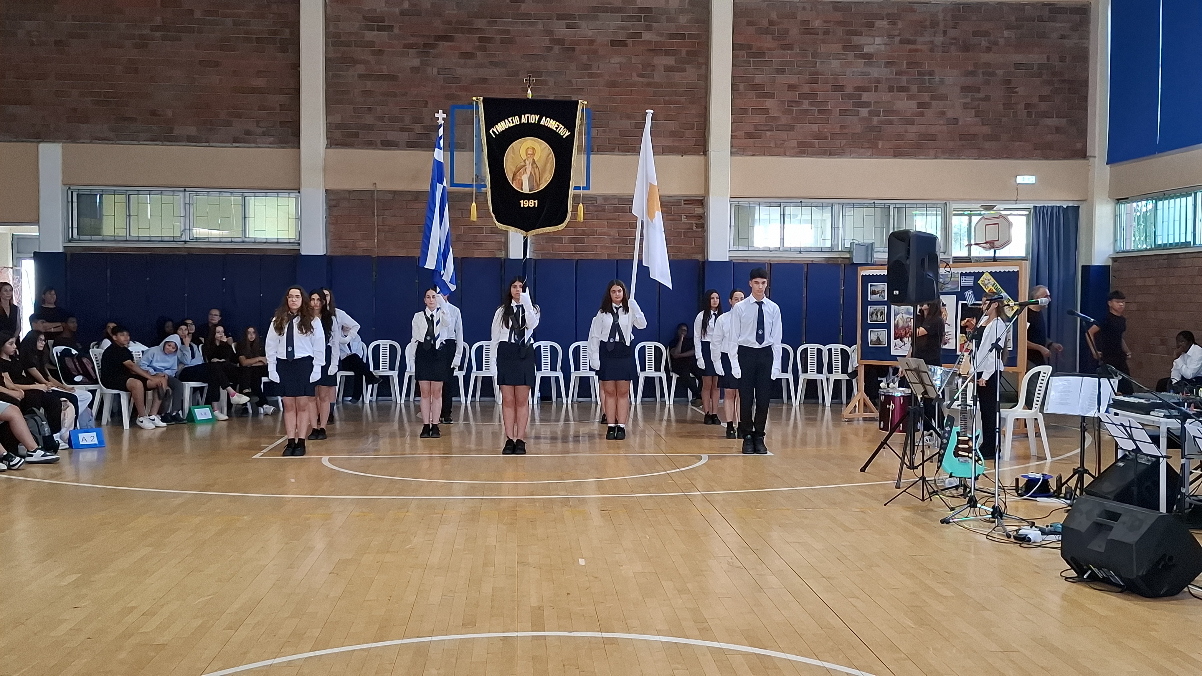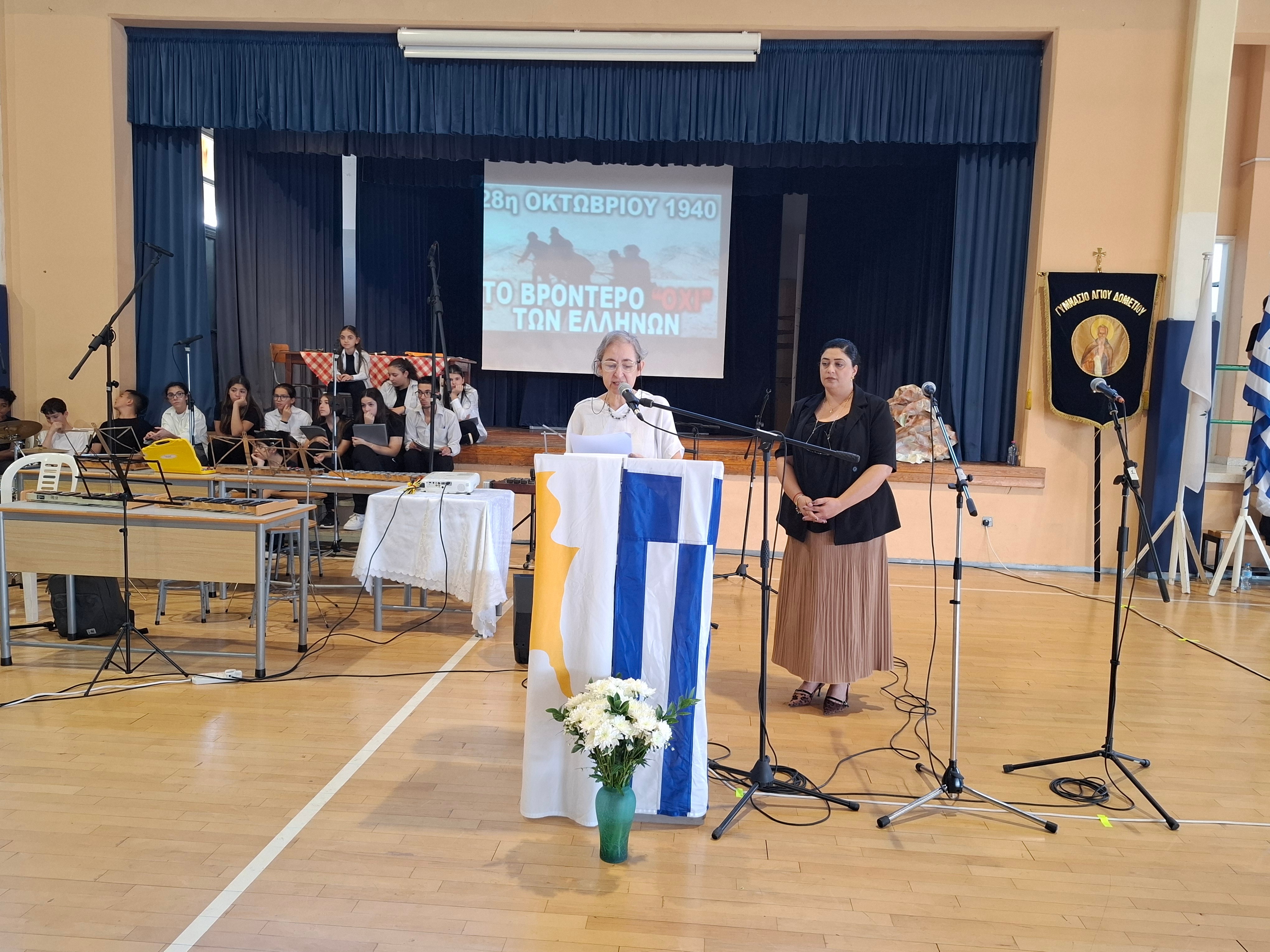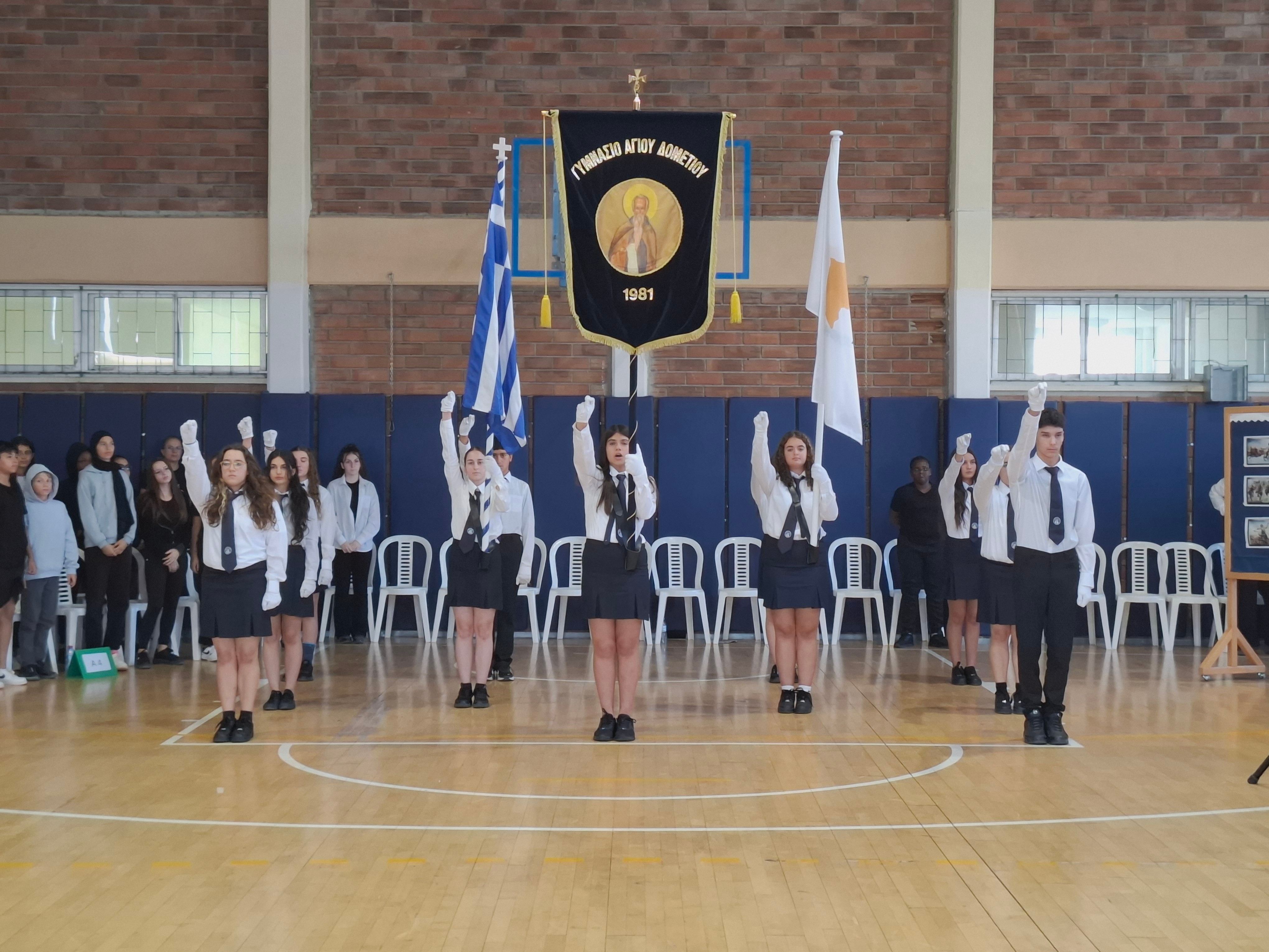 Στις 27 Οκτωβρίου 2025, η Σχολική Κοινότητα του Γυμνασίου Αγίου Δομετίου απέτινε και φέτος, φόρο τιμής στους αγωνιστές της ελευθερίας που βροντοφώναξαν «ΟΧΙ» και αντιστάθηκαν, όχι μόνο στην επεκτατική πολιτική του Μουσολίνι αλλά και της Ναζιστικής Γερμανίας.