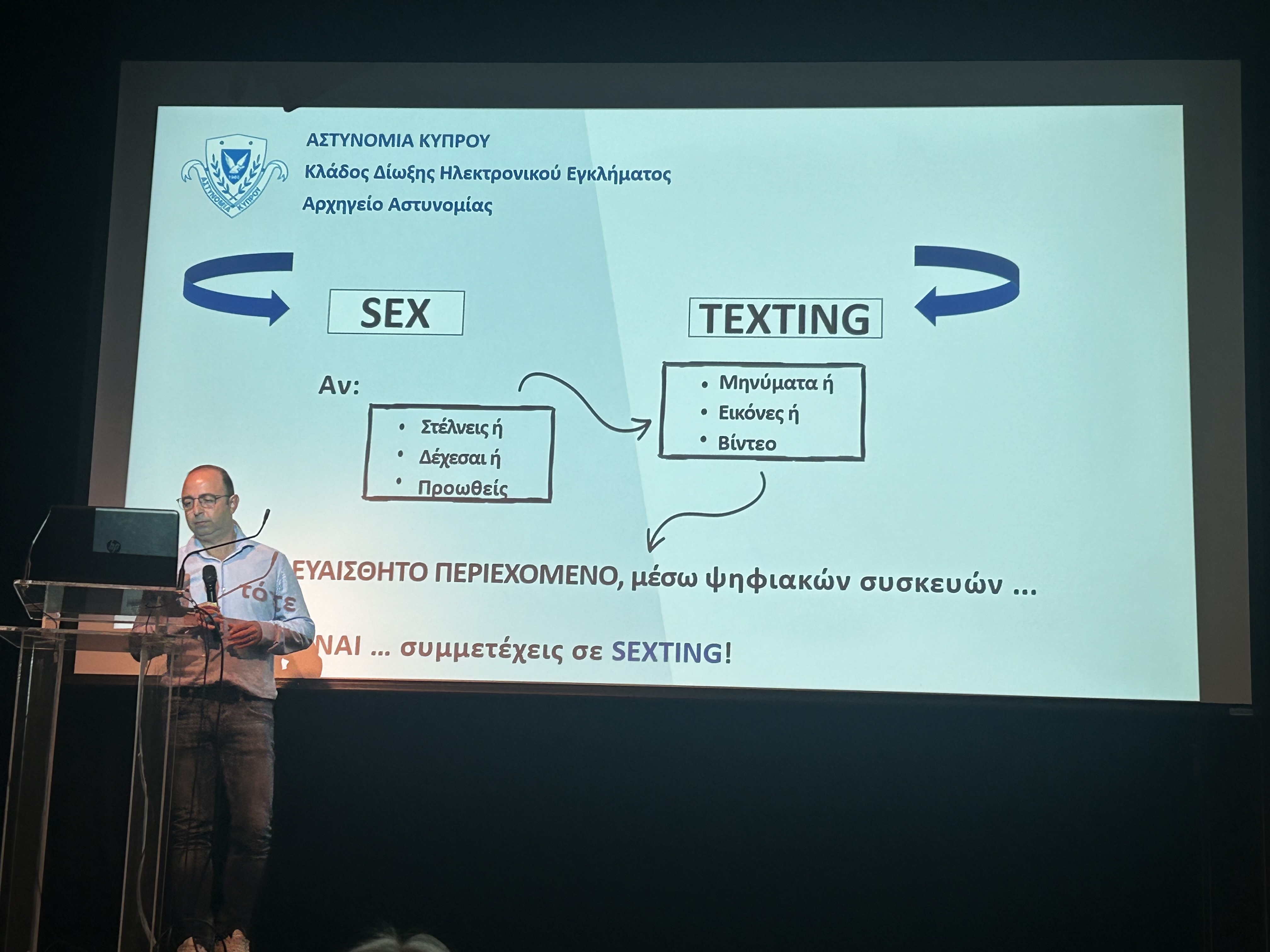 Πραγματοποιήθηκε την Πέμπτη, 13 Νοεμβρίου στη Λευκωσία, στο Κτήριο ΠΟΕΔ, Ημερίδα που αφορούσε στην πρόληψη της σεξουαλικής κακοποίησης παιδιών μέσω του διαδικτύου, με έμφαση στην προστασία από το sexting και απευθυνόταν σε εκπαιδευτικούς και μαθητές/μαθήτριες Μέσης Εκπαίδευσης. Την Ημερίδα παρακολούθησαν οι μαθήτριες του Σχολείου μας Παντελίδη Κατερίνα Γ3, Παντελίδη Νικολέττα Γ3, Μυτιληνέλη Χρύσια Μαρία Γ3 και Ιωάννου Χρίστια Β3. Τις συνόδευσαν οι καθηγήτριες Μήτσιου Αγγέλω και Μελίνα Κωνσταντίνου